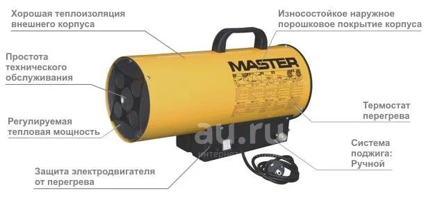 Отличительной чертой тепловой пушки MASTER BLP 33 Е является также ее мобильность – при габаритах 590 x 260 x 360 мм и весе 9 килограмм, она работает с мощностью до 30 кВт. Все детали этой модели газовой тепловой пушки проверены. Долгую службу, также, обуславливают и исзносостойкое покрытие корпуса и прочная конструкция.