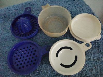 В состав изделия входят основание объемом 200 мл, крышка и три насадки: соковыжималка для цитрусовых, сепаратор для яиц, терка.