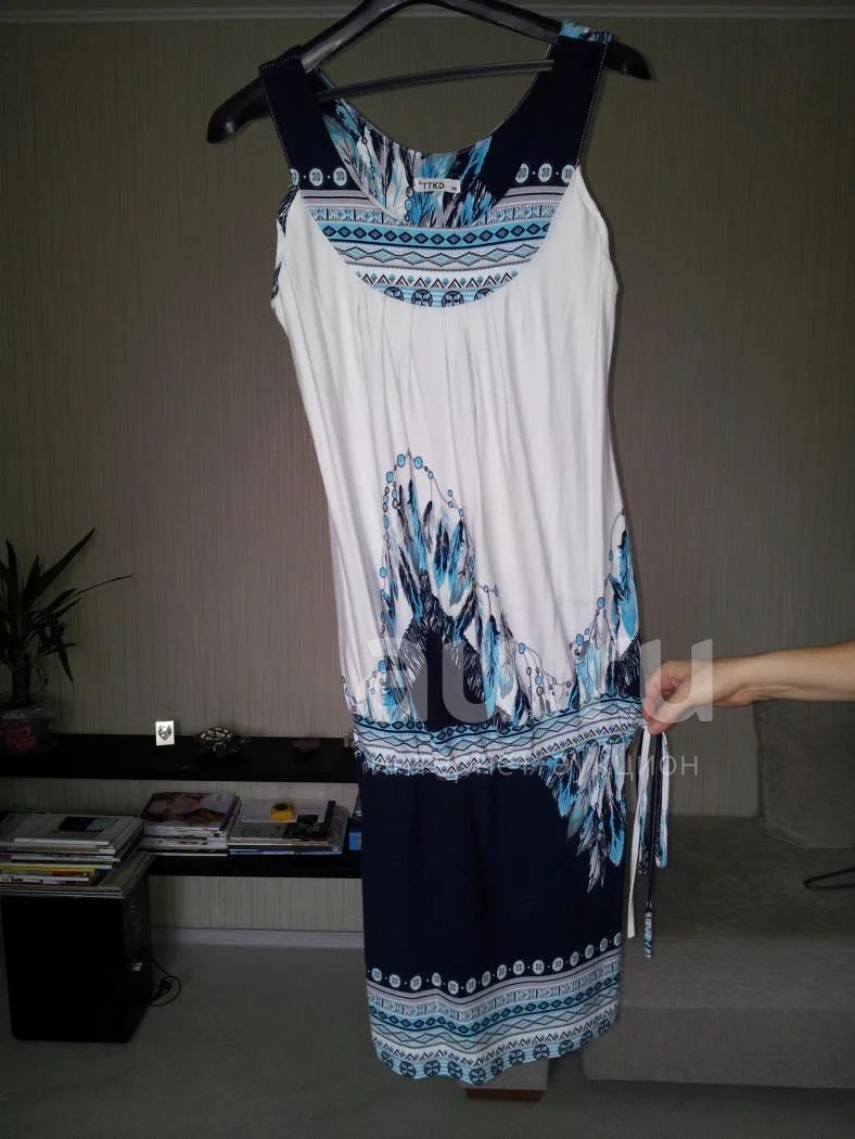 Платье на лето. В нем легко, удобно, не жарко. Ткань-стрейч, поэтому движения не сковываются..Спереди и сзади-одинаковый красивый принт. В районе бедер-эластичный декоративный шнурок. Длина платья регулируется 100см.-105см.