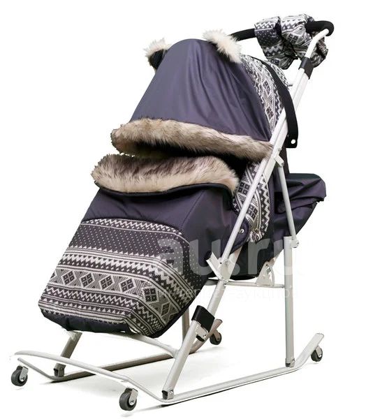 Санки-коляска "Скандинавия" 4 колеса + перекидная ручка + положение лежа + веселые ушки и отделка мехом. БЕЛая рама