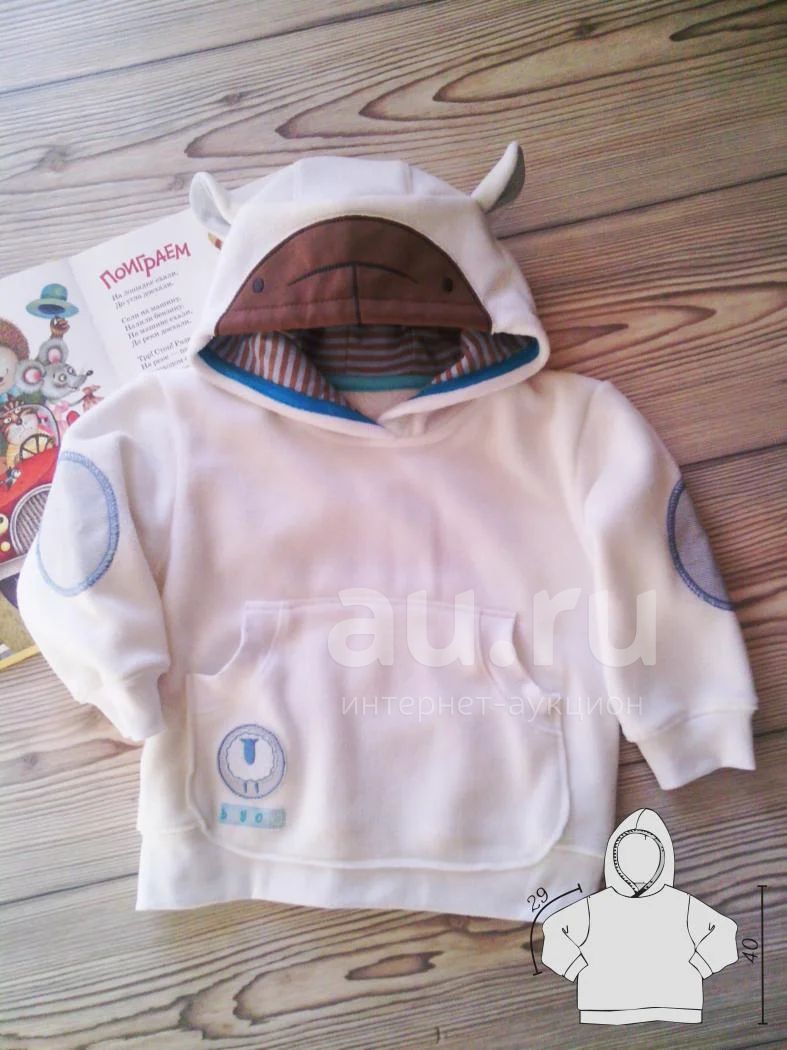 Толстовка из белого флиса с капюшоном для мальчика. В капюшоне подклад из хлопчатобумажного трикотажа, а также выполнена аппликация мордочки и ушек барашка, на рукавах - декоративные локти из ткани в мелкую полоску.