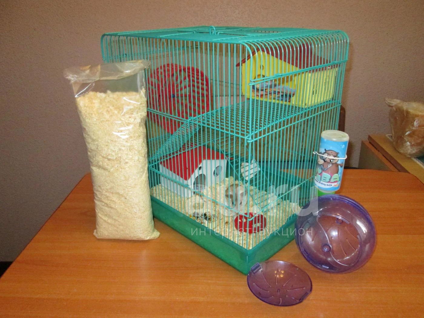 Прилагается шарик для путешествий, корм, наполнитель, колесо, поилка, камень для зубов.