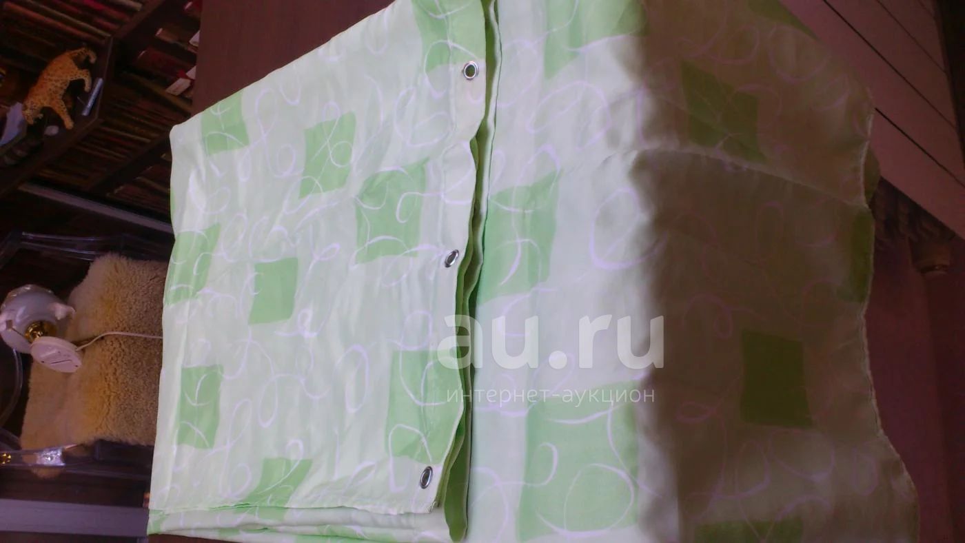 Штора отличная, практически новая, нежно-салатового цвета, большая, качественная водоотталкивающая ткань. Стирается и гладится