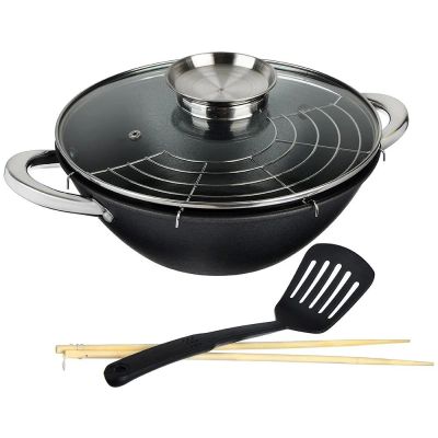 Казан выполнен из высокопрочного алюминия отлитого под высоким давлением, уплотненная конструкция казана хорошо сохраняет тепло, не деформируется, обладает высококачественным, долговечным двухслойным керамическим покрытием, легко моющаяся внутренняя и наружная поверхность, возможность приготовления пищи без жира, предусмотрена мойка в посудомоечной машине. Размер казана 24 см в диаметре