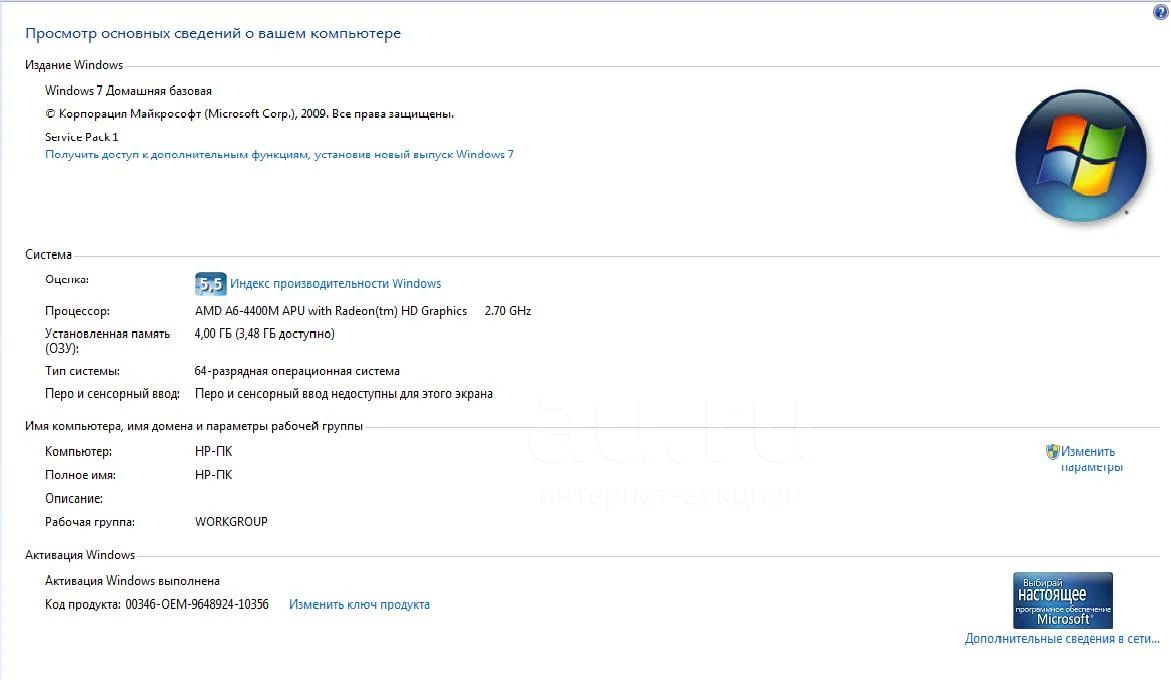 Установленная операционная система: Win 7 Home Basic