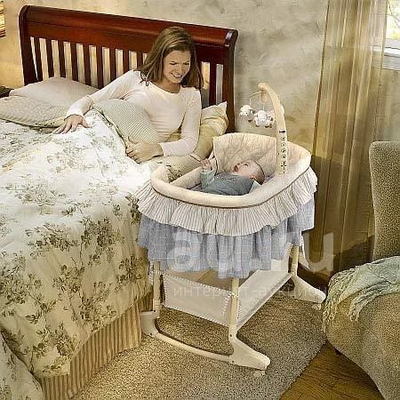 Колыбель с электронной системой укачивания, колыбельными мелодиями и подвесными игрушками.