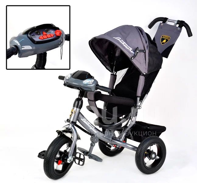 Велосипед 3-х кол с диаметром колес 12" и 10" дюймов, надувные колеса, материал: резина, рама: сталь, хромированные крылья, сидение со спинкой, подгузник, несколько положений спинки, багажная корзина, колясочная крыша, глубокий козырек, двойная ручка управления, складная подножка, мягкий подголовник, разъемный мягкий страховочный обод, сумочка для мелочей, глубокий козырек, звуковая и световая панель (фара со светом, звуком мотора и поворот. сигналами).