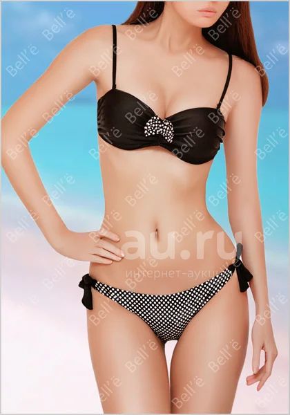 Купальник раздельный черного цвета с бюстгальтером бандо. Бюстгальтер однотонный, украшен бантиком с рисунком "горошек", лямки регулируются, съемные, завязывается на спине. Трусики выполнены из ткани с рисунком "горошек", низкая посадка, по бокам на широких завязках