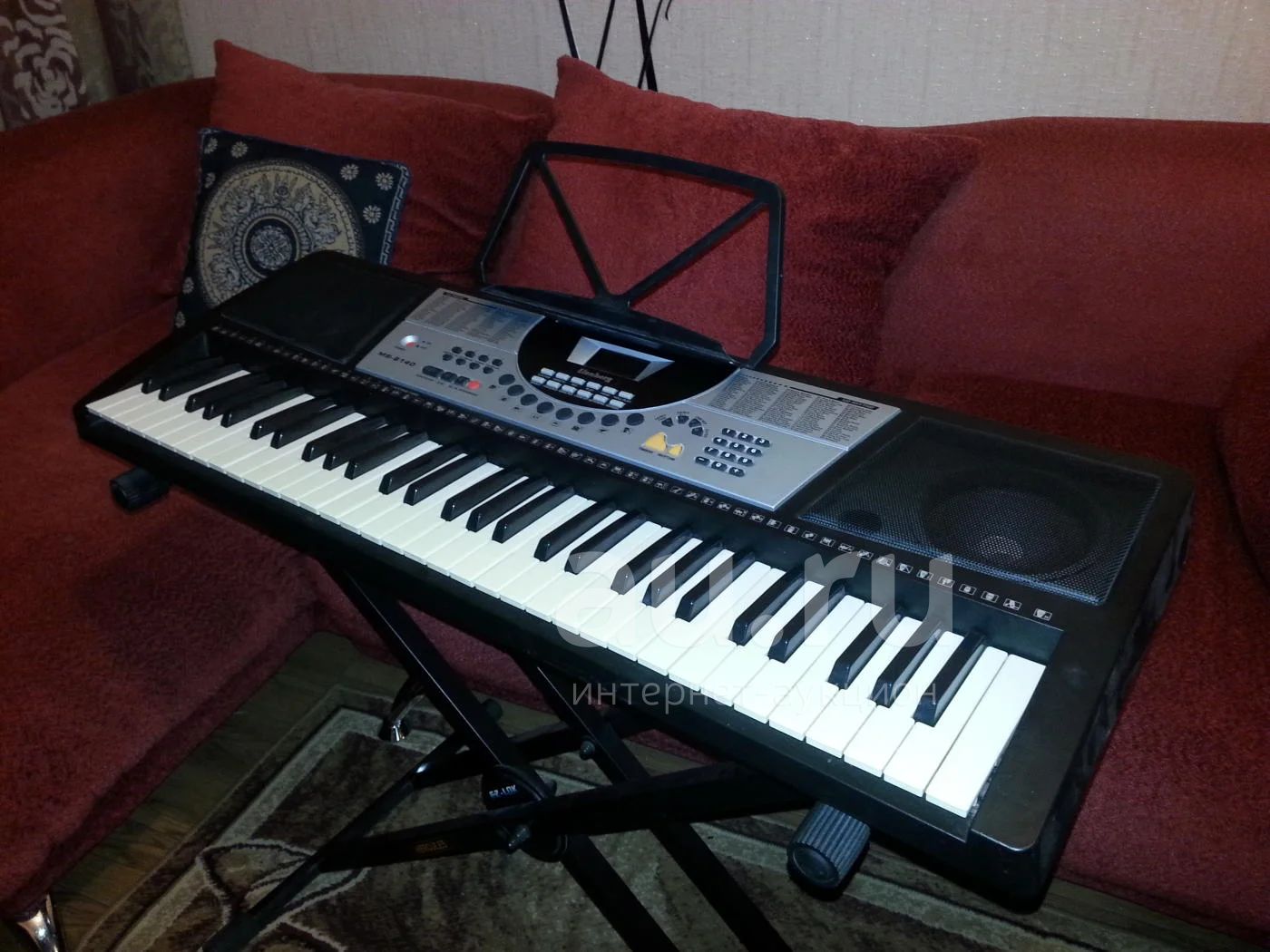 Синтезатор Elenberg, модель ms-6140. Можно включать от сети, либо от батареек. Подключается микрофон. Можно записывать проигрываемые мелодии. Транспозиция, синхронизация, 100 демо-мелодий