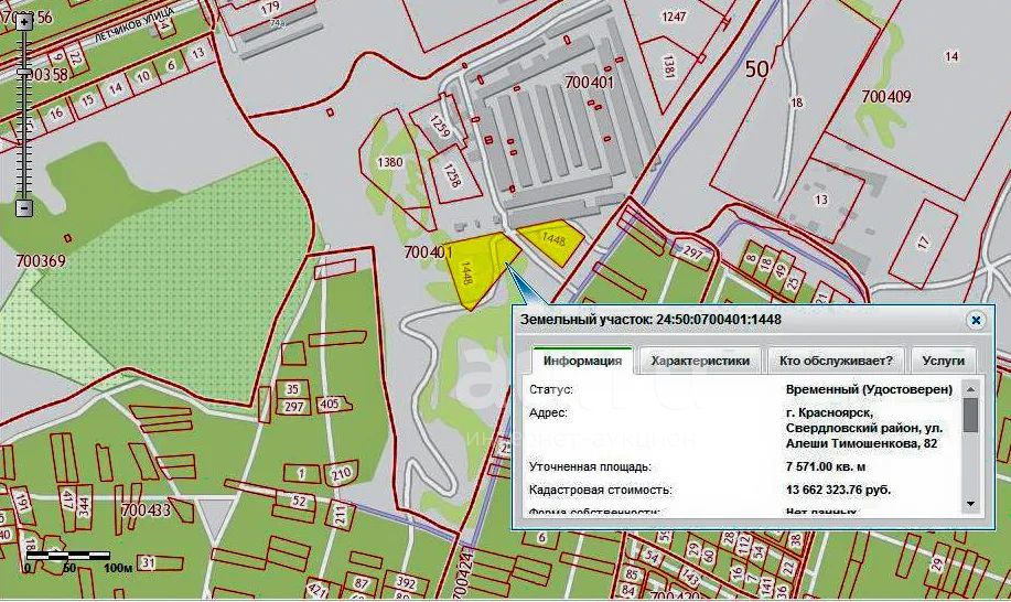 Предлагается к продаже земельный участок в городе Красноярске, Свердловский район, п. Водники, ул. Алеши Тимошенкова, 82, кадастровый номер 24:50:0700401:1448, площадью 0,7571 га под капитальное строительство, назначение - строительство базы со складскими помещениями. Участок расположен в промзоне города Красноярска, в ближайшем окружении объекта находится дачный массив и гаражный кооператив, удаленность от асфальтовой дороги составляет 200 м, прямо на участок идет гравийная дорога. Участок имеет двойную форму, чем удобен для совместного инвестирования, а так же возможного поочередного строительства.