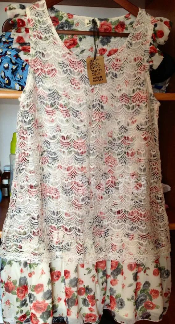 Платье двухслойное. Нижнее платье из полиэстера в цветочек, верхнее из нейлонового кружевного полотна. Новое. Куплено было в Андорре, цена на этикетке. Размер 44.