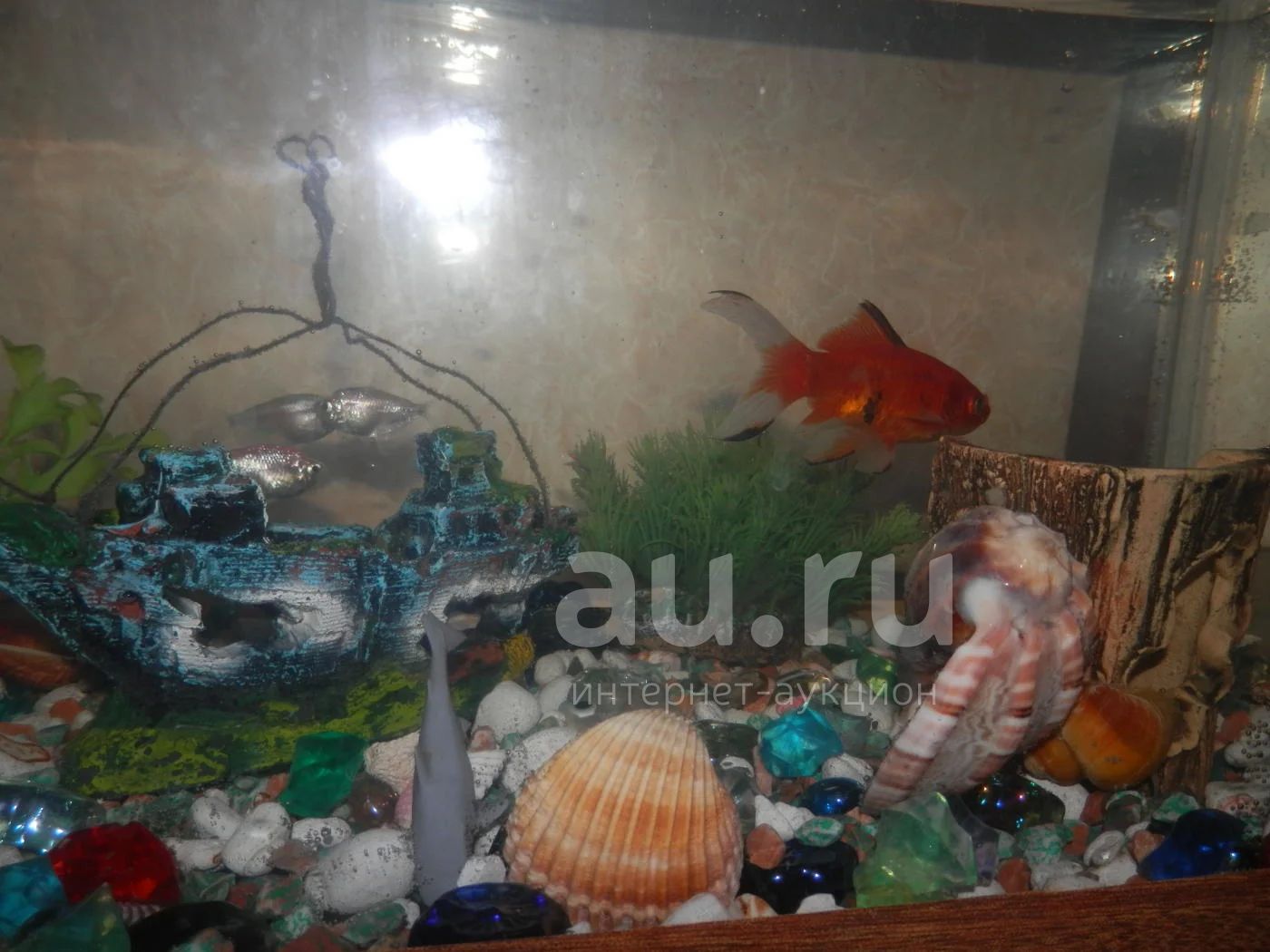 Аквариум с украшениями красивые зеркальные камешки, ракушки необычные и т.д. , 5 рыбок, 2 улитки и их детки, свет, фильтр, сочок, шланг и еда (2 пакета)-все, что нужно!!!