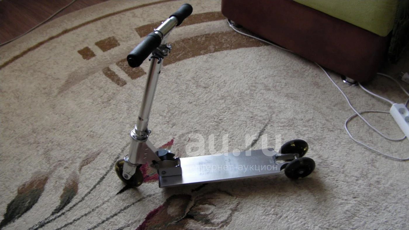 Складной самокат в хорошем состоянии ( катался ребенок до 6 лет) в сложенном состоянии компактен, регулировка руля по высоте (максимально до 80 см) Переднее колесо и одно заднее при движении светятся (синий-красный встроенный светодиод) Самокат алюминиевый очень легкий, имеет ручку для переноски.
