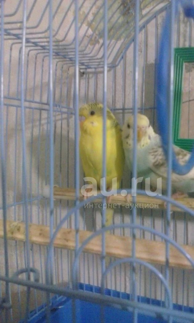 2 Попугая желтенький мальчик,бело-голубая девочка.продается сразу 2 в месте с клеткой и всем что есть для них!