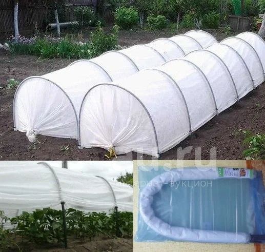 Материал можно сдвигать вверх и вниз по дугам, что очень удобно для полива, сам же материал пришит к дугам и его не сорвет никакой ветер!