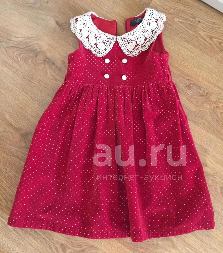 Яркий красивый сарафанчик в мелкий горошек с ажурным воротничком из бархата. Размер 116-122.