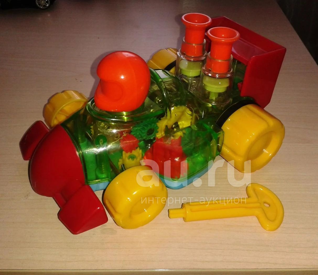 Очень качественный пластик. Заводится ключиком, при этом крутятся шестеренки внутри и двигаются клапаны-поршни сзади. Ездит очень быстро.