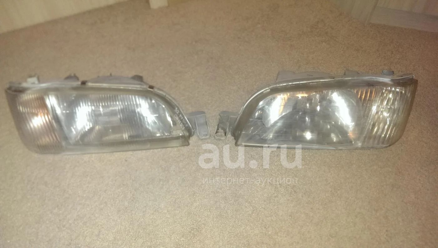 Фары от Toyota Camry, кузов SV40, состояние на фото. У левой фары нет верхнего крепления, и ремонтировано нижнее крепление, нет цоколя поворотника, рефлекторная. У правой фары треснуто верхнее крепление, не рефлекторная. На обоих нет уплотнительных резинок по бокам, видны мелкие брызги краски от горе-маляров.