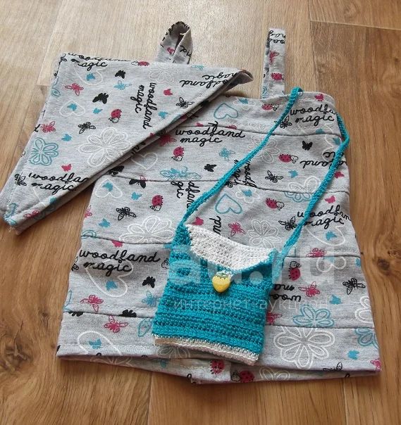 Маечка и косыночка для вашей девочки,все новое,на возраст от года до двух с половиной,зависит от комплекции ребенка. Маечка легко одевается за счет липучки,которая находится сзади и отстегивается до конца,на лямочках.Косыночка на обхват головы до 52 см,в подарок маленькая сумочка,застегивается на пуговку.Все новое!