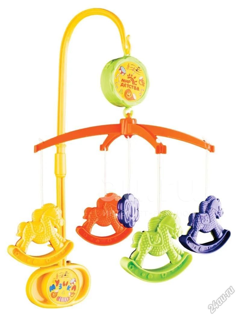 Устанавливается над кроваткой. Не требует батареек. При вращении звучит музыка. Развивает у новорожденного слух, воображение, концентрацию внимания, цветовое восприятие.