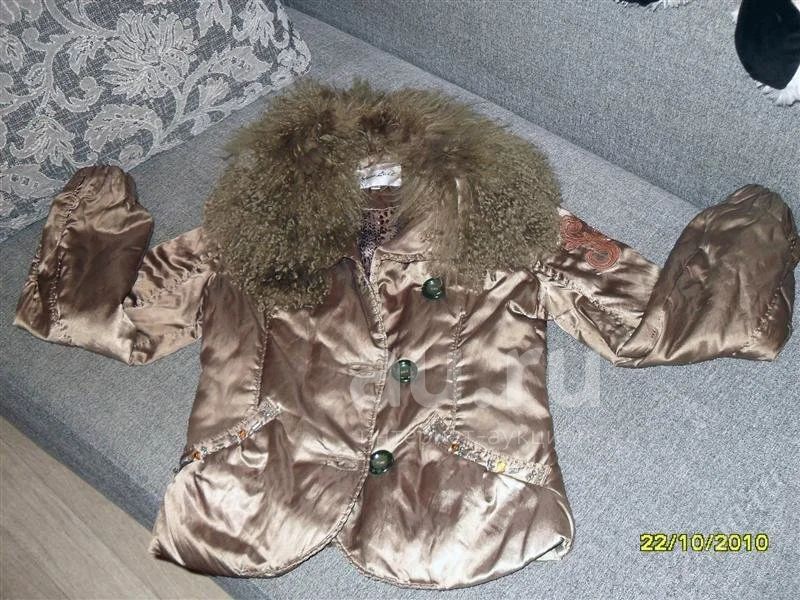 Куртка на осень-весну, воротник натуральный отстегивается, на карманах нашиты бусинки, вышивка на левом руке сбоку, рукава на резинке, полнота регулируется пояском сзади, пуговицы перешивала так как мне изначально была широковата.Можно мерить.