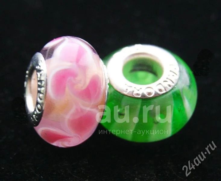 В комплект входят 2 подвески в виде бусин к браслету, материал - стекло + серебро 925, диаметр ~1,5 см.