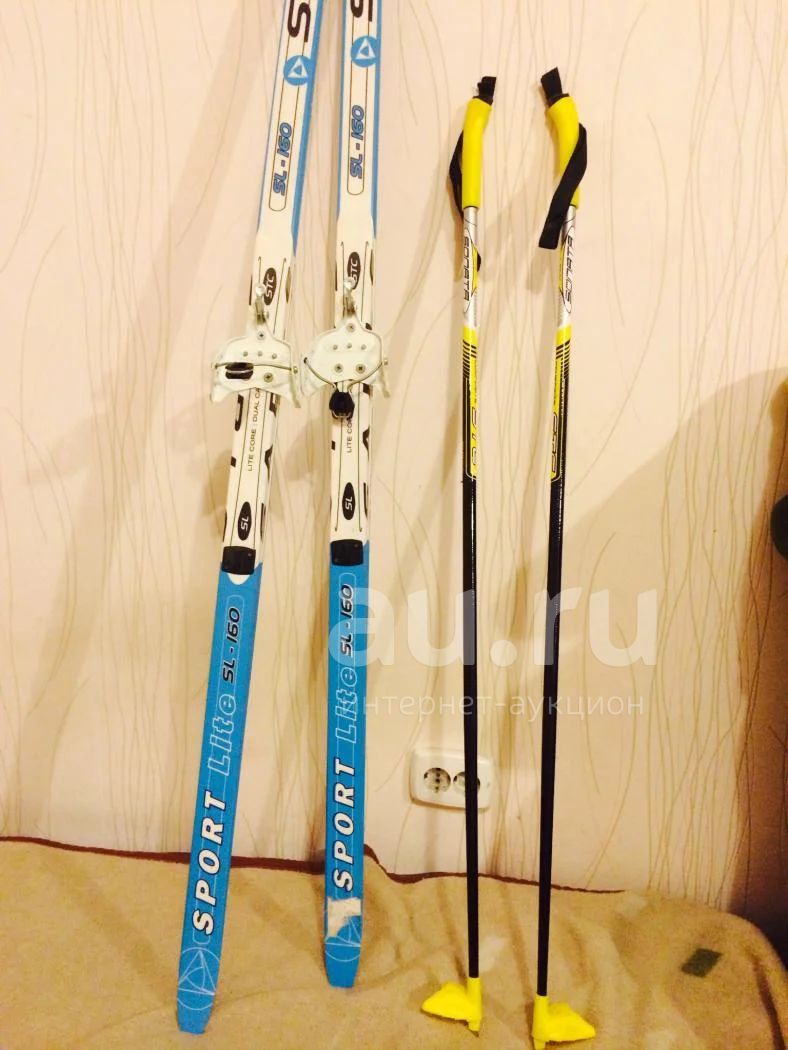 Лыжи беговые пластиковые, длина лыж 160 см, длина палок 110см, пользовались 1 раз, 35 размер ботинок, натуральная кожа, подкладка: искусственный мех