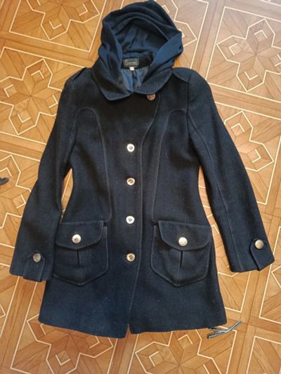 Хорошее пальто темно синего цвета. Размер лучше всего подойдет на 42 (S). Но если перешить пуговицы, подойдет как на 40, так и на 44.