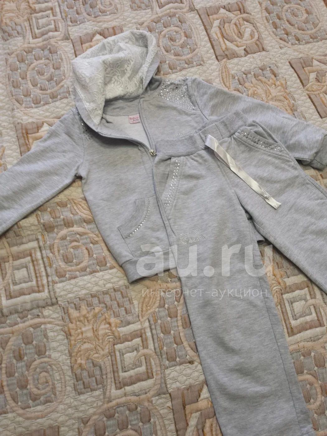 Отличный спортивный костюм. Украшен стразами, капюшон отделан кружевом. Можно стирать в стиральной машине