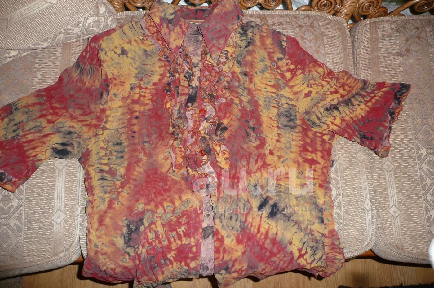 Отличная блуза, в целом состояние хорошее, нона спине есть дырочка размером со спичечную головку, на груди красивые рюши, по рукавам тоже.