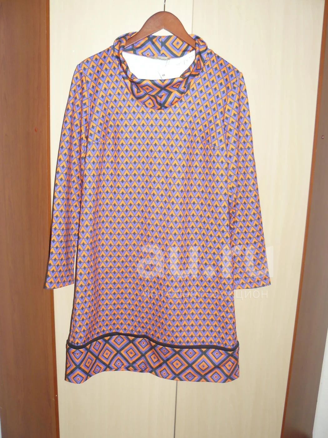 Лекало в форме трапеции, свободного кроя, с длинными рукавами. Состав: 60% хлопок, 35% вискоза, 5% эластан, ткань совсем не мнётся.