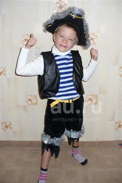 Костюм пирата на 5-7 лет. Одет один раз, состояние отличное.В комплекте- треуголка, жилетка совмещенная с тельняшкой(под кожу), брюки(белая водолазка не от костюма). Костюм обшит мишурой(как на фото).Фирма производитель- Компания "Смоленские игрушки".Длина штанишек 45см+ неровные края 4 см, в поясе штанишки полуобхват 27 см, на резинке, тянутся.Длина безрукавки 30см, ширина 30см(полуобхват), к низу чуть шире 38 см.Треуголка на 50размер, может чуть больше, но она должна сидеть не глубоко, на макушке.