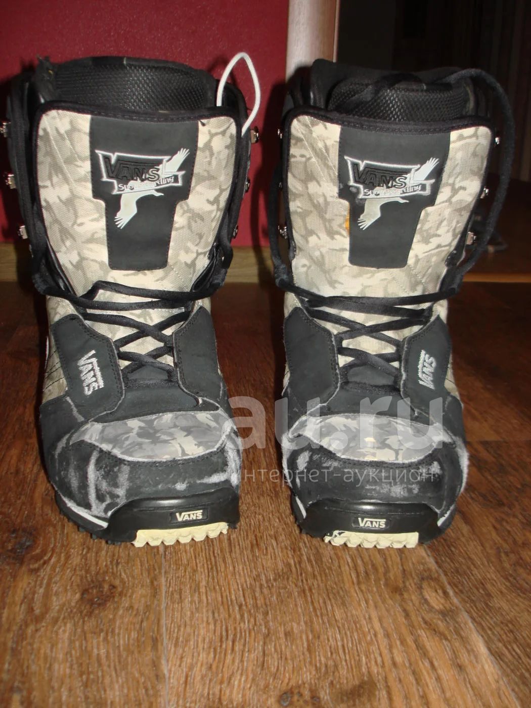 Хорошие ботинки VANS, износились снаружи, возможно можно чем то закрыть войлок просто, дырок нет, катанию не мешает. Не промокают, хорошо держат ногу. Довольно старые, но могут еще прослужить немало сезонов. Все видно на фото. Даже коробка сохранилась. Размер написан M и 44. 42-43 оптимально.