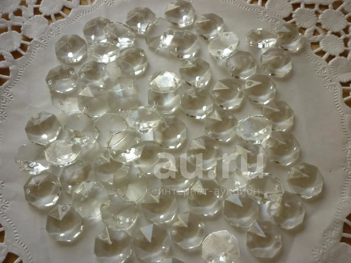 Подвески чистейшего стекла(фото не получилось), с одной стороны плоские с другой граненый конус, имеют два отверстия. Диаметр 2,2 см.
