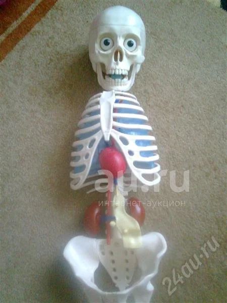 скелет из пластмассы, разбирается на части. в комплект входят внутренние органы- мозг, сердце, легкие, почки, поджелудочная железа. ног и рук нет.