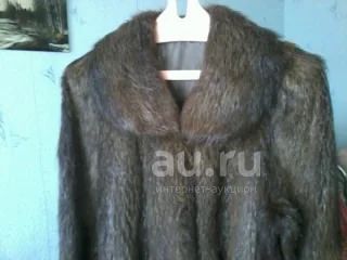 Шуба из нутрии, размер 52-56, цвет полосами коричневый с желтоватым оттенком, длина от плеча 117 см, длина от нижней проймы рукава 88 см.
