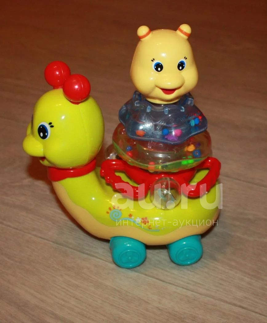 Б\у в хорошем состоянии, все работает. 2 режима, поет песню и светится, либо просто светится. Пирамидка состоит из 3х самостоятельных погремушек, 2 звонкие, 1 (внутри вода с шариками) гремит тихо. Возрастная категория у игрушки с 6 мес, но многим детям интересно гораздо раньше. Мы играли с 4х мес погремушками, потом следили за улиткой, потом учились собирать пирамидку