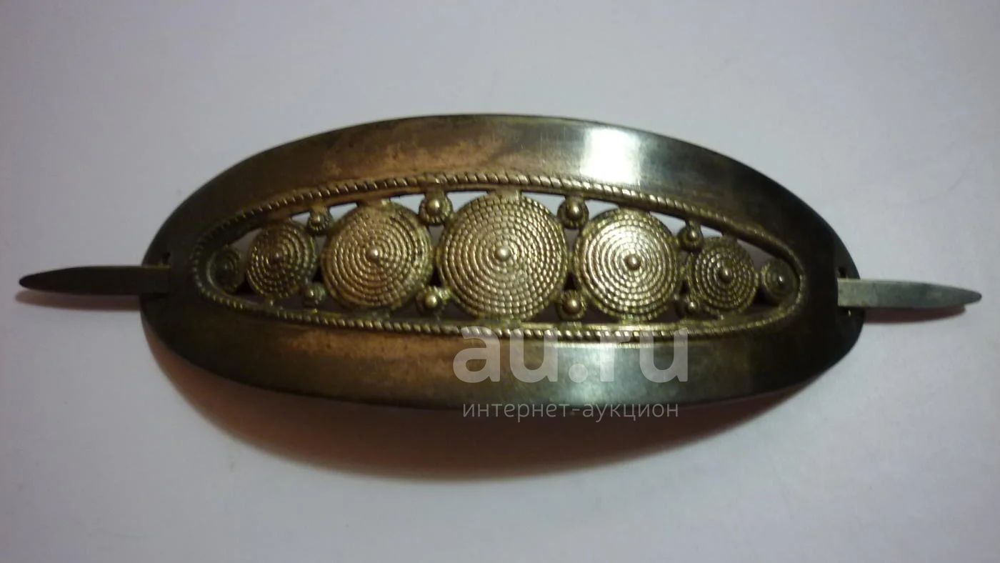 Имеется клеймо ФП3 - Подольская ювелирная фабрика(завод) 1961 - 1965г, ранее артель "По заветам Ильича". Также есть еще оттиск - форма не понятна, то ли кит, то ли еще что... Длина заколки по дуге 10 см, длина вставки 12см. Требует небольшой чистки.