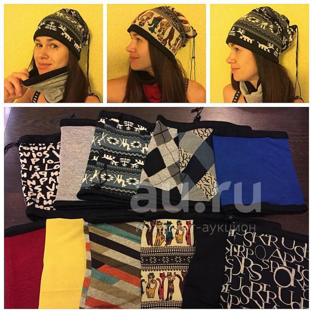 С одной стороны флис, с другой теплая ткань. Имеют утяжку с одной стороны и ловко превращаются в шапочку. Отлично греют шею, а если приподнять выше, то нос и лицо тоже будут в тепле.