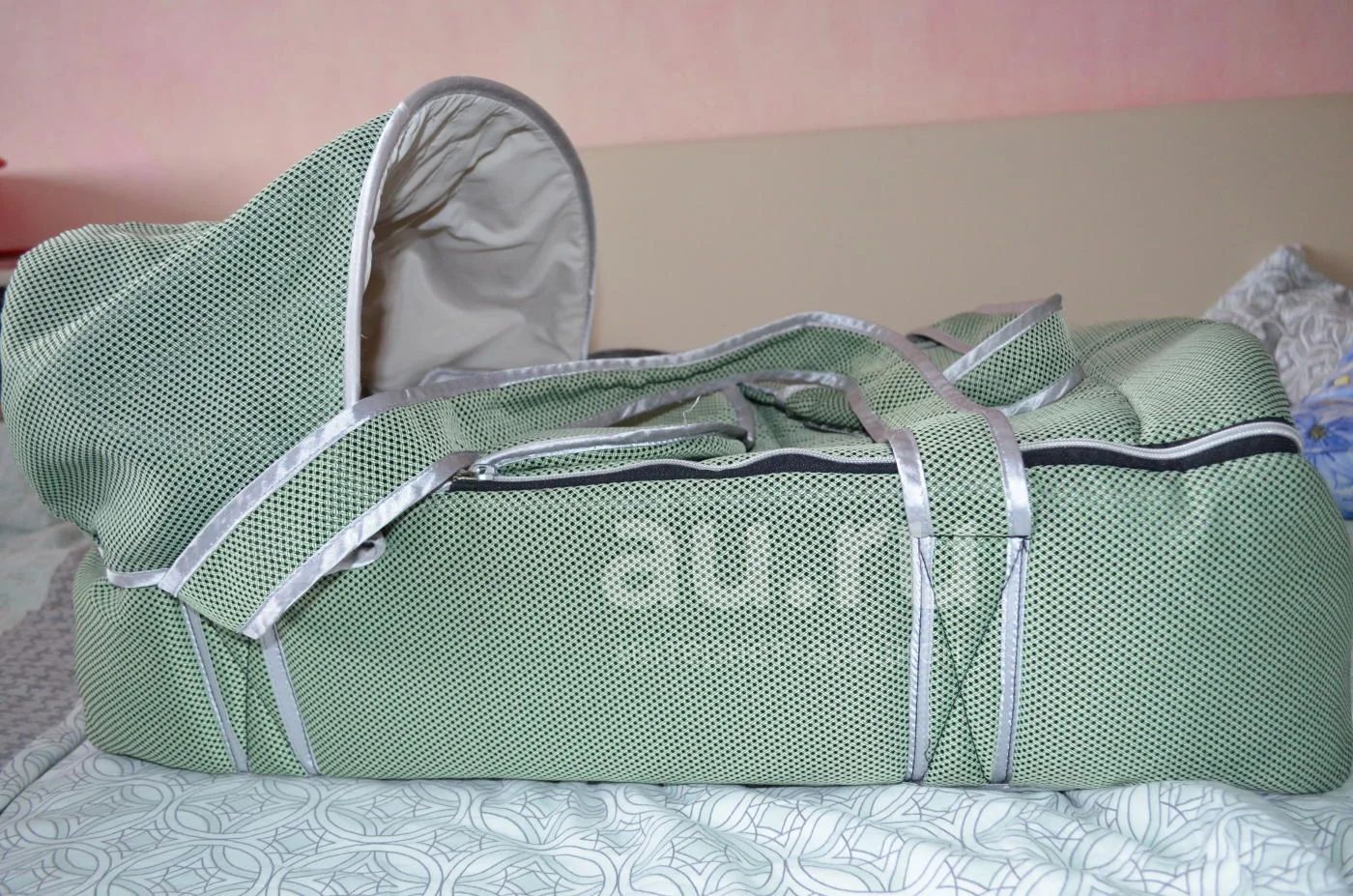 Жесткое дно . Для стирки переноски,донышко можно расстегнуть и вытащить. Съёмный капюшон (защитит в непогоду и закроет от солнца , при необходимости-можно отстегнуть ). Козырек можно пристегнуть к капюшону, чтоб не задувал ветер, дождь , было теплее и просто поможет спрятать малыша от любопытных глаз
