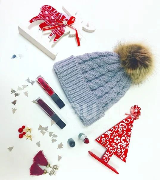 Стильная серая вязаная шапочка. Помпон из искусственного меха.