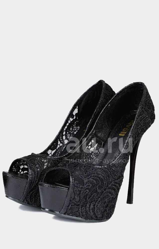 Красивые туфли черного цвета выполненные из плотной сетки с кружевами. Стелька сделана из искусственной кожи. У данной модели присутствует блестяще-черная оконтовка из текстиля, которая придает больше изящества. Детали: каблук-шпилька, высота оторого 14 см, высота платформы 4 см, открытый мыс.