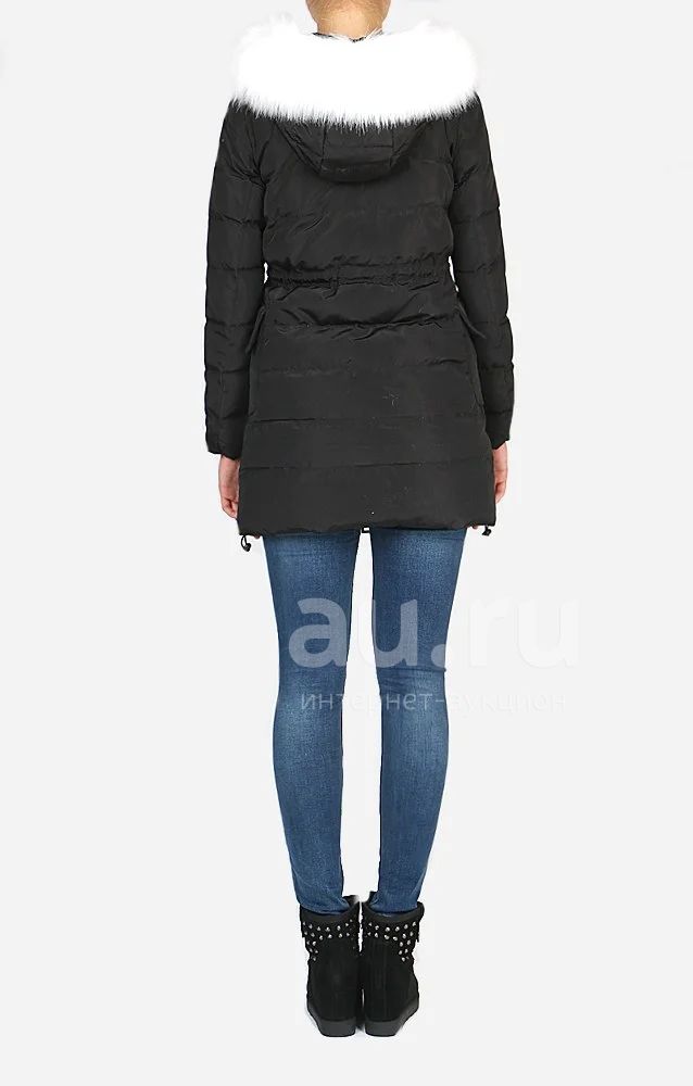 Пуховик черного цвета с белым мехом приталенного кроя. Модель утеплена пухом и пером, два кармана, резинка на талии, застежка-молния, в комлекте идет шарф.