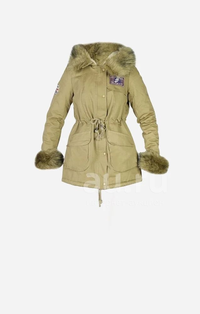Утепленная парка выполнена из плотной джинсовой ткани бежевого цвета. Модель приталенного кроя. Детали: подкладка из искусственного меха; несъемный капюшон и манжеты из натурального меха; застежка на молнию и планка на кнопках; два внешних боковых кармана; резинки на манжетах.