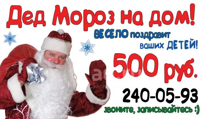 Антикризисное предложение! Успевайте записаться! Наш весёлый Дед Мороз поздравит ваших детей с Новым годом с шутками, прибаутками, загадками! В лучших новогодних традициях! Плюс живой интерактив - шуточный танец Деда Мороза вместе с вашими детьми с повторением движений Программа 15-20 минут! Наша фишка - ПОДАРОК каждому ребёнку фирменное именное письмо от Деда Мороза с пожеланиями на год! Текст письма согласовываем с родителями предварительно. Цена самая доступная - 500 руб! Запись открыта на все предновогодние дни. Записывайтесь скорее! Запись и все вопросики по тел. 240-05-93