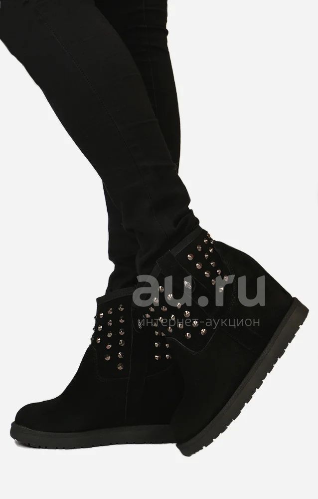 Комфортно и удобно - это про угги! Модель выполнена из замши черного цвета с декоративными клепками. Внутри искусственный мех, скрытая танкетка и широкая форма голенище. Плотная рефленая подошва.
