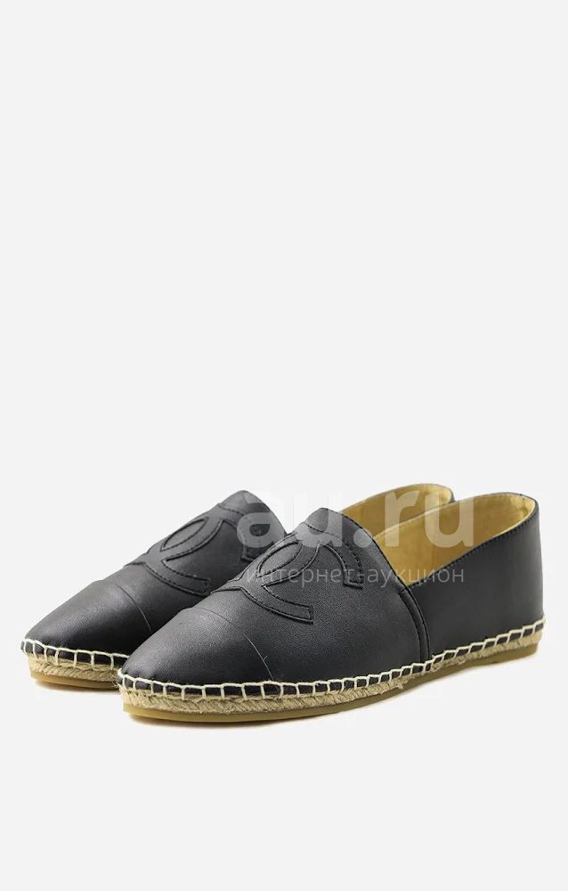 Модная и удобная обувь этого сезона - эспадрильи от всеми любимого бренда Chanel. Модель черного цвета выполена из натуральной кожи. Внутренняя отделка и стелька изготовлены из искусственной кожи. Детали: закругленный носик черного цвета, вышивка значка бренда, джутовая подошва.