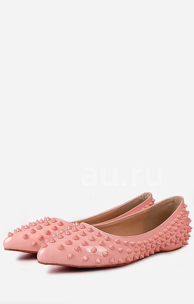 Изысканные и стильные балетки Christian Louboutin светло розового цвета. Модель покрыта шипами и выполнена из лакированной кожи, подклад и стелька - искусственная кожа. Детали: заостренная носочная часть, красная подошва.