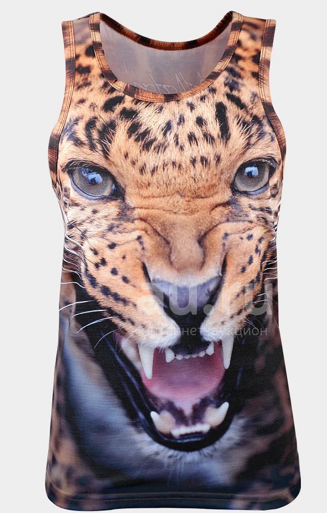 Майка выполнена из качественного синтетического материала. Детали: круглый вырез, без рукавов, леопардовый принт с с рисунком леопарда.