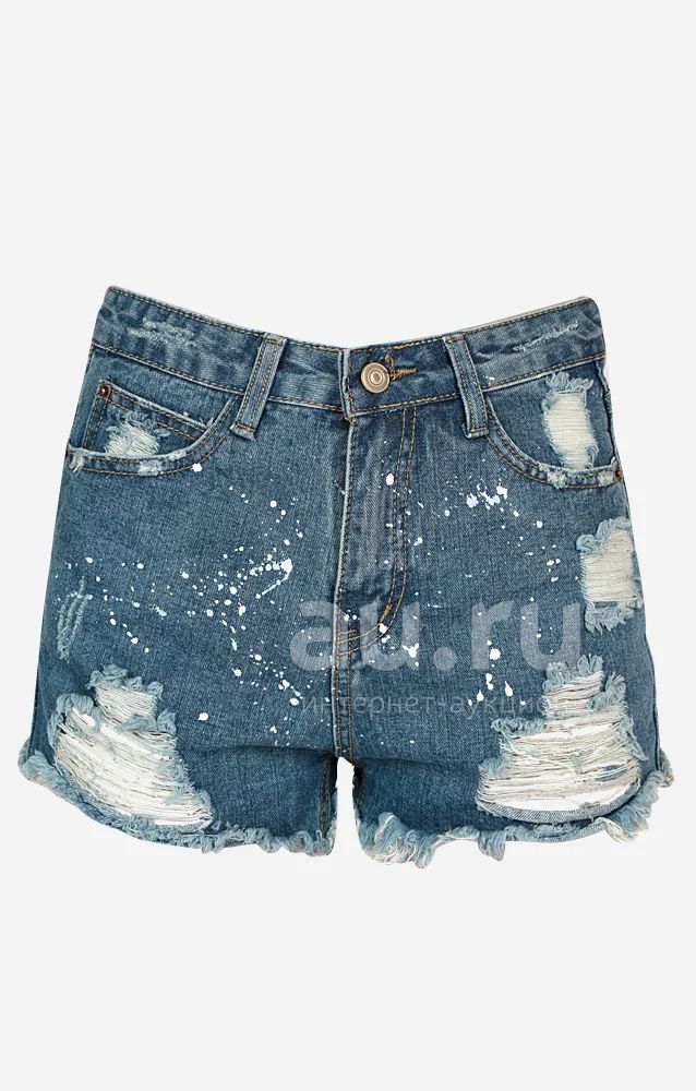 Джинсовые шорты из денима темно - синего с декоративными порезами и потертостями. Детали: высокая посадка, застежка на молнию и пуговицу, пять карманов; шлевки под ремень.